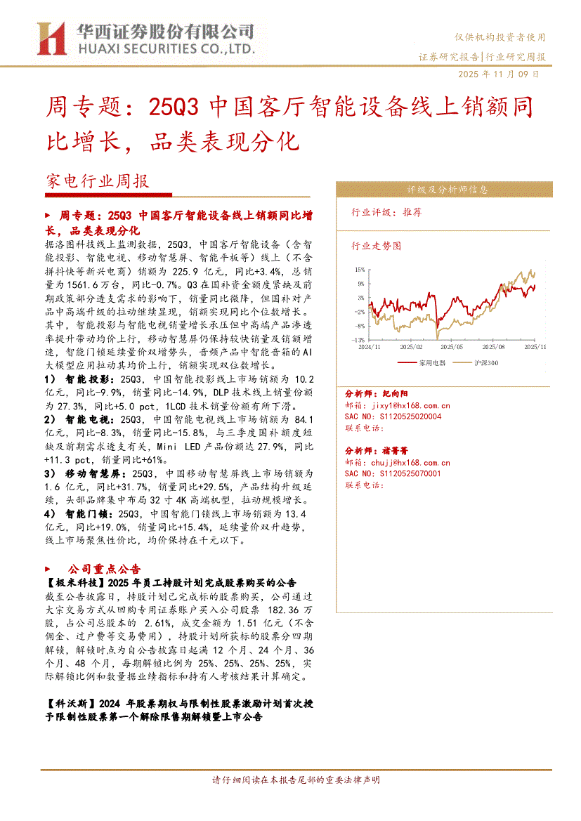 家电行业:华西证券-家电行业周报:周专题,25Q3中国客厅智能设备线上销额同比增长,品类表现分化-251109