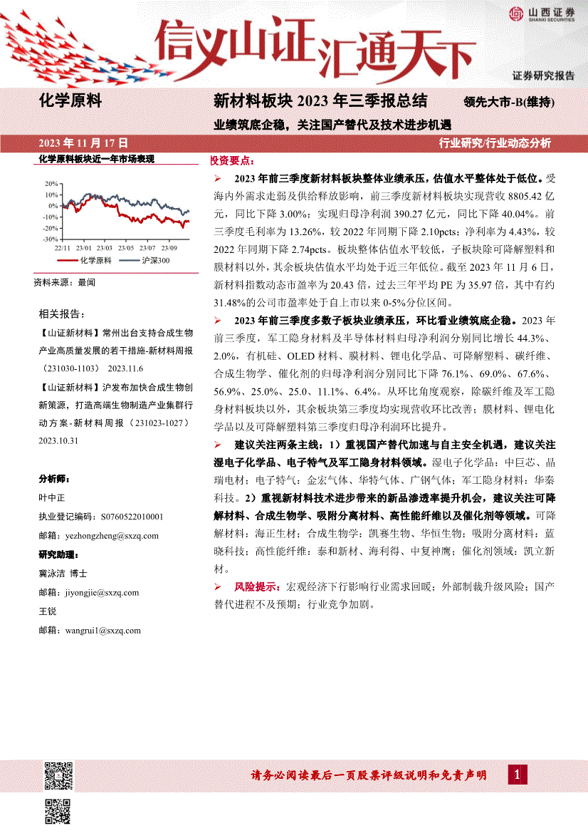化学原料行业:山西证券-新材料行业板块2023年三季报总结:业绩筑底企稳,关注国产替代及技术进步机遇-231117