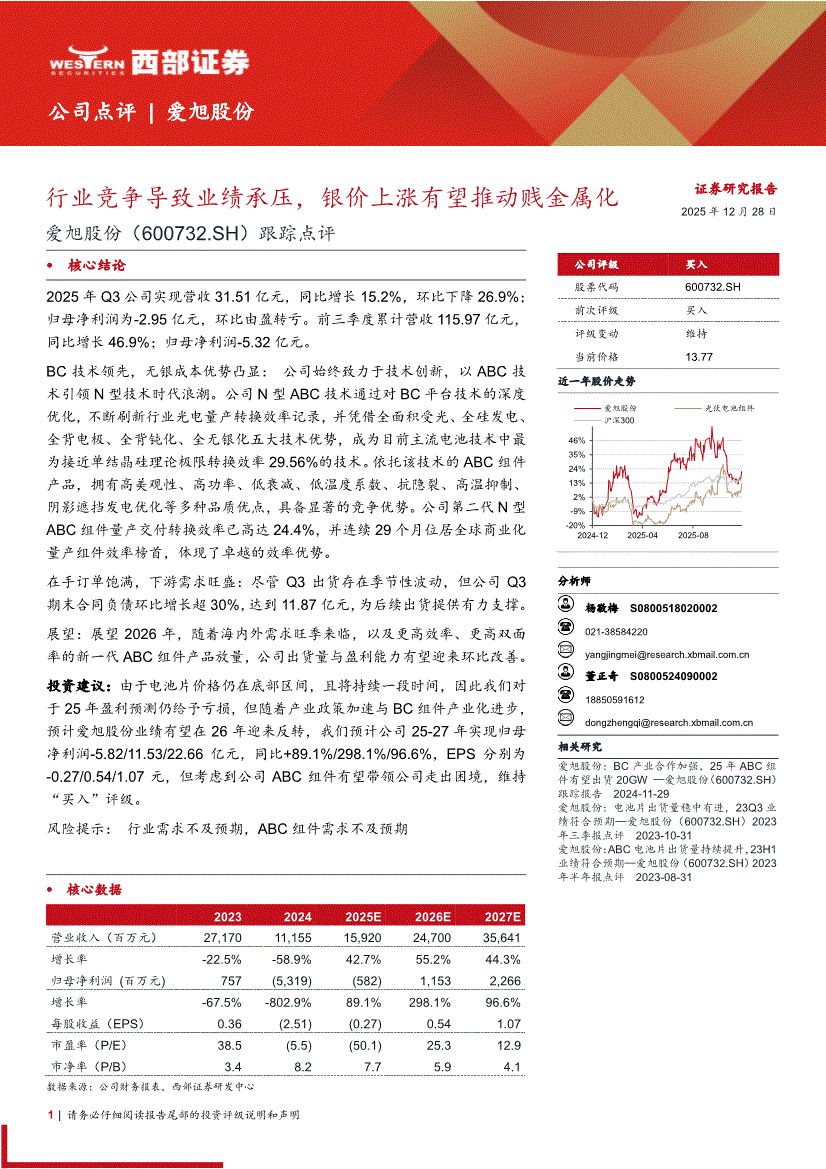 爱旭股份:西部证券-爱旭股份-600732-跟踪点评:行业竞争导致业绩承压,银价上涨有望推动贱金属化-251228