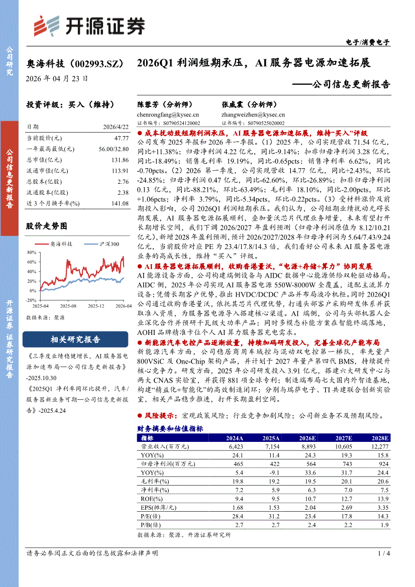 奥海科技:开源证券-奥海科技-002993-公司信息更新报告:2026Q1利润短期承压,AI服务器电源加速拓展-260423
