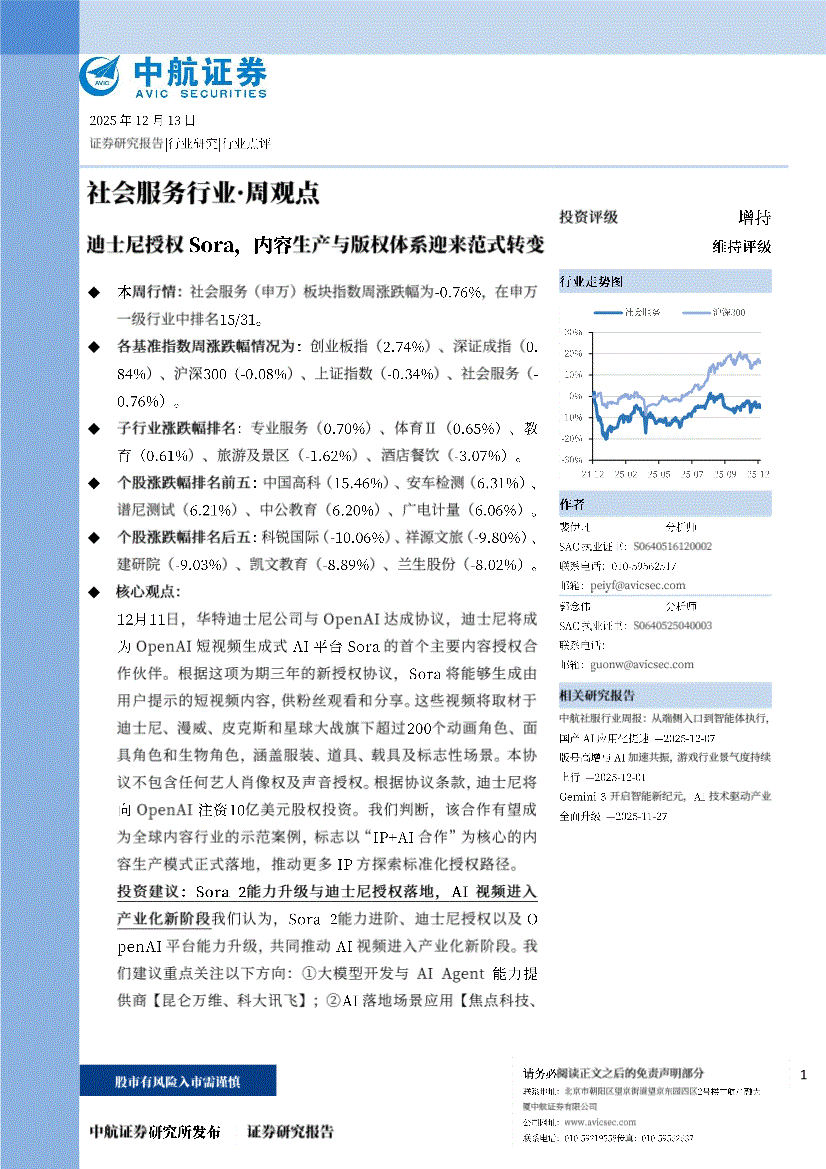 社会服务行业:中航证券-社会服务行业·周观点:迪士尼授权Sora,内容生产与版权体系迎来范式转变-251213