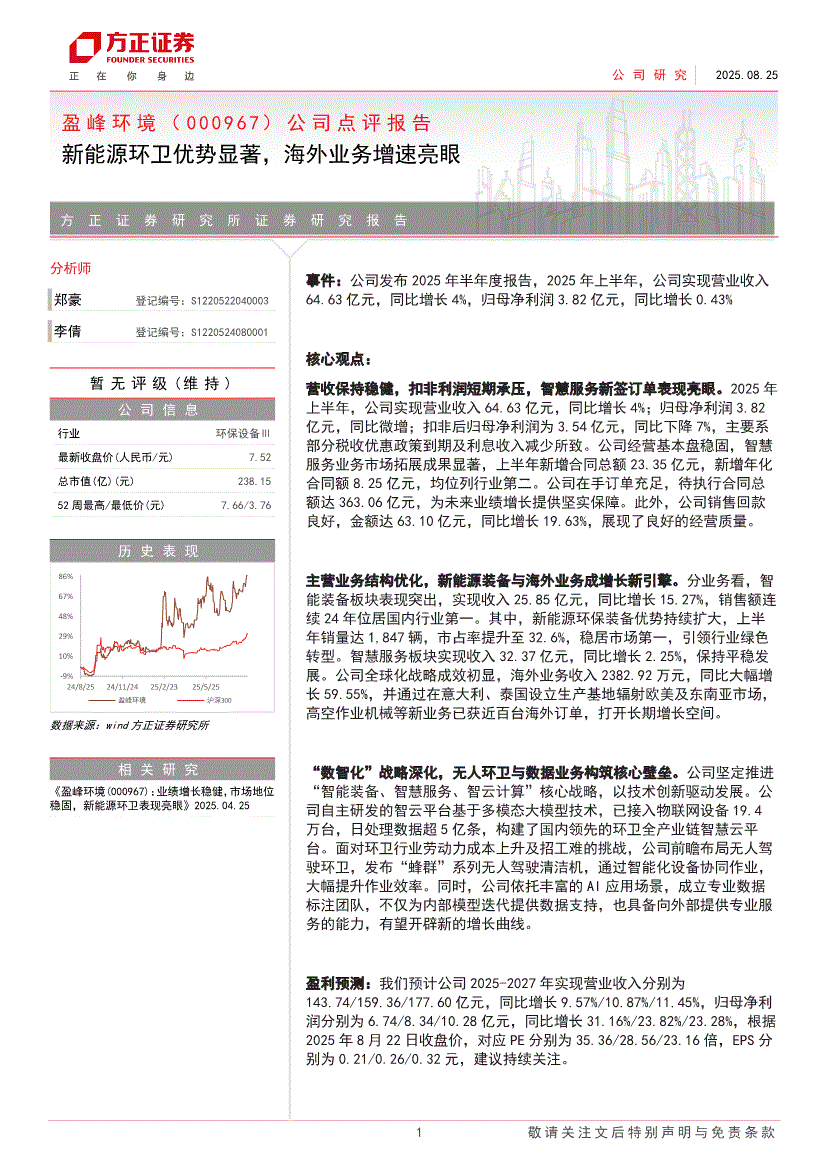 盈峰环境:方正证券-盈峰环境-000967-公司点评报告:新能源环卫优势显著,海外业务增速亮眼-250825