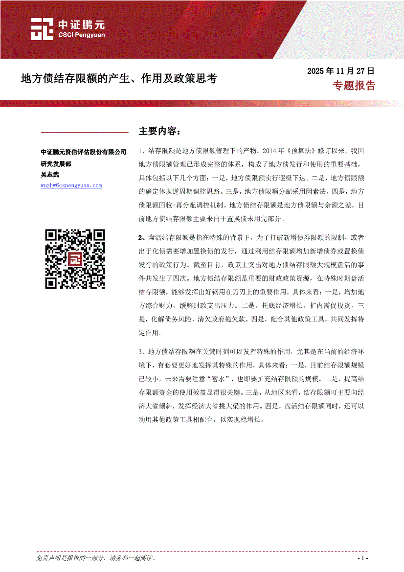 中证鹏元资信评估股份有限公司-专题报告:地方债结存限额的产生、作用及政策思考-251127