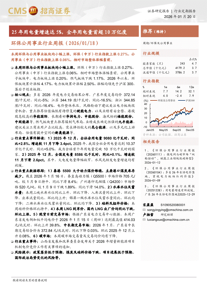 环保公用事业行业:招商证券-环保公用事业行业周报:25年用电量增速达5%,全年用电量首超10万亿度-260120