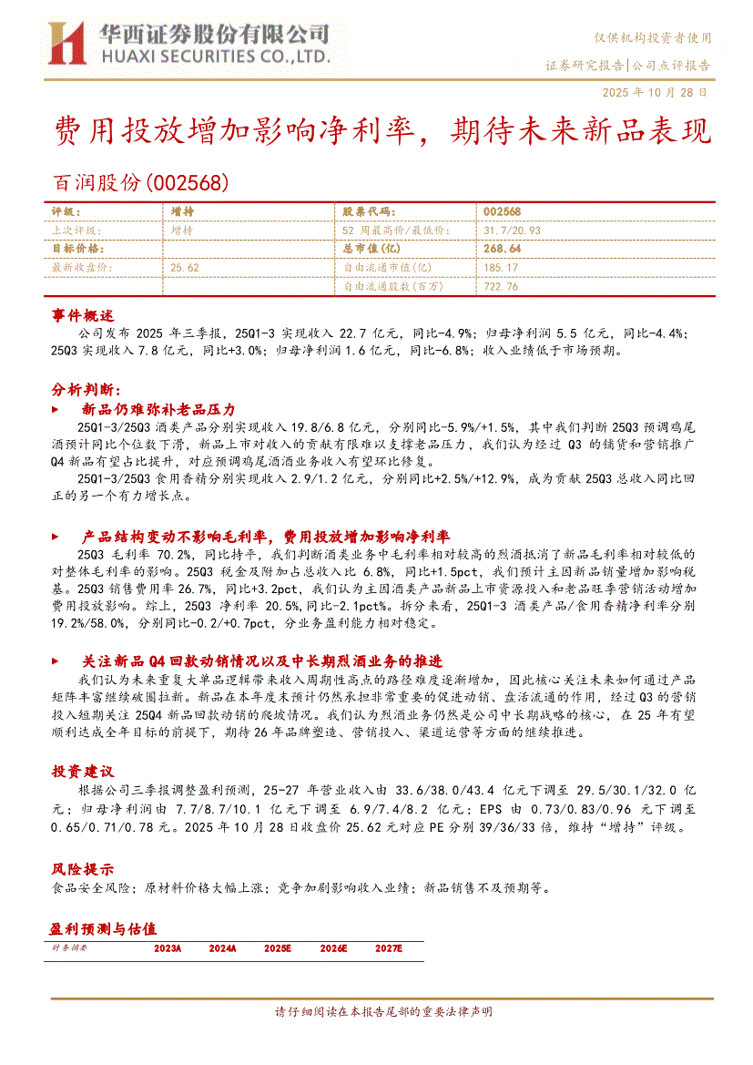 百润股份:华西证券-百润股份-002568-费用投放增加影响净利率,期待未来新品表现-251028