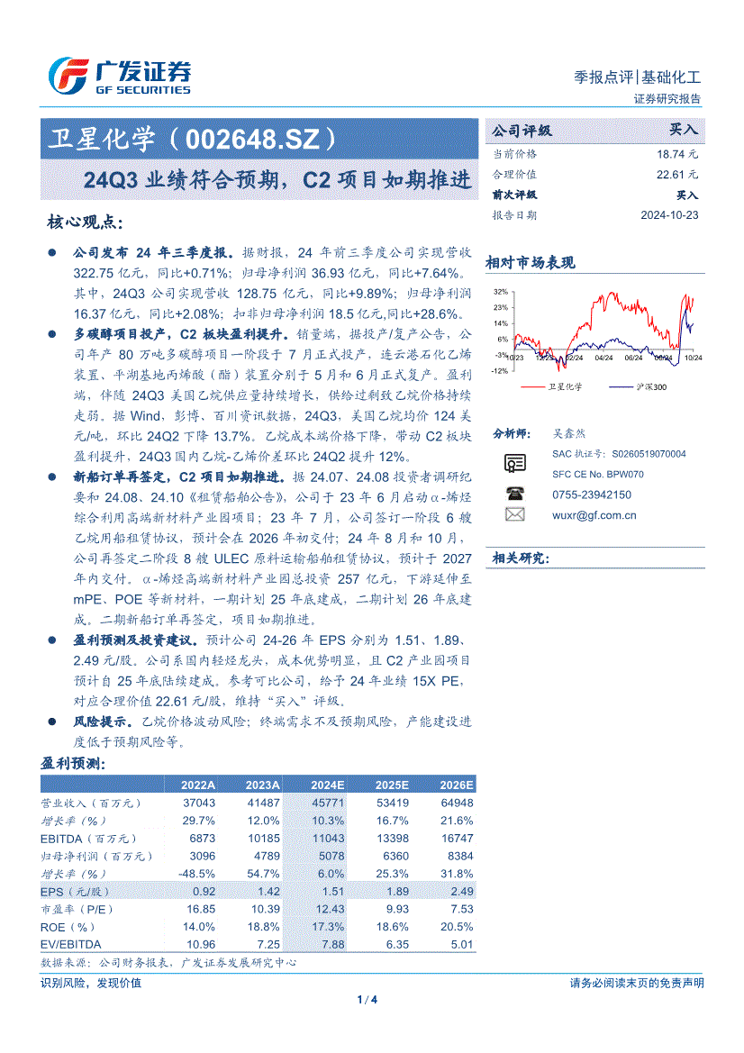 卫星化学:广发证券-卫星化学-002648-24Q3业绩符合预期,C2项目如期推进-241023