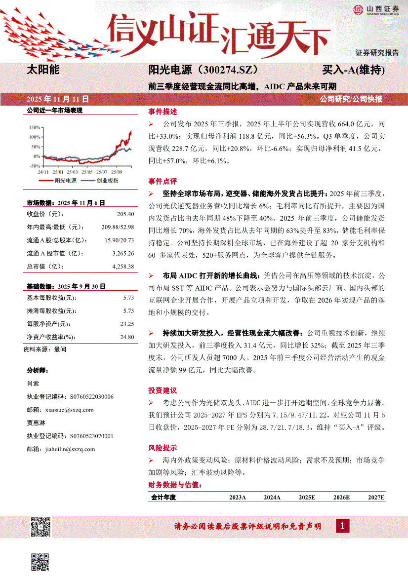 阳光电源:山西证券-阳光电源-300274-前三季度经营现金流同比高增,AIDC产品未来可期-251111