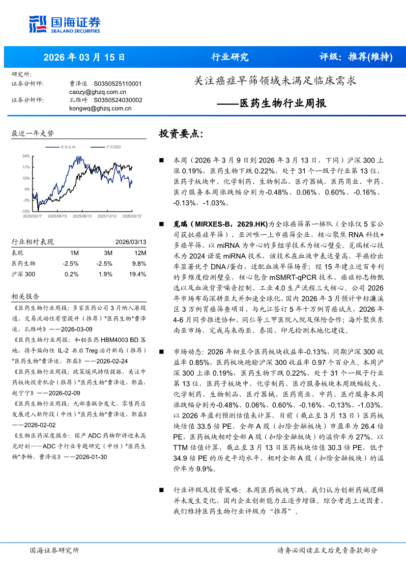 医药生物行业:国海证券-医药生物行业周报:关注癌症早筛领域未满足临床需求-260315