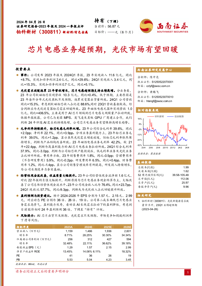 铂科新材:西南证券-铂科新材-300811-芯片电感业务超预期,光伏市场有望回暖-240426
