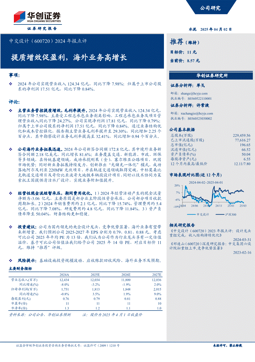 中交设计:华创证券-中交设计-600720-2024年报点评:提质增效促盈利,海外业务高增长-250402