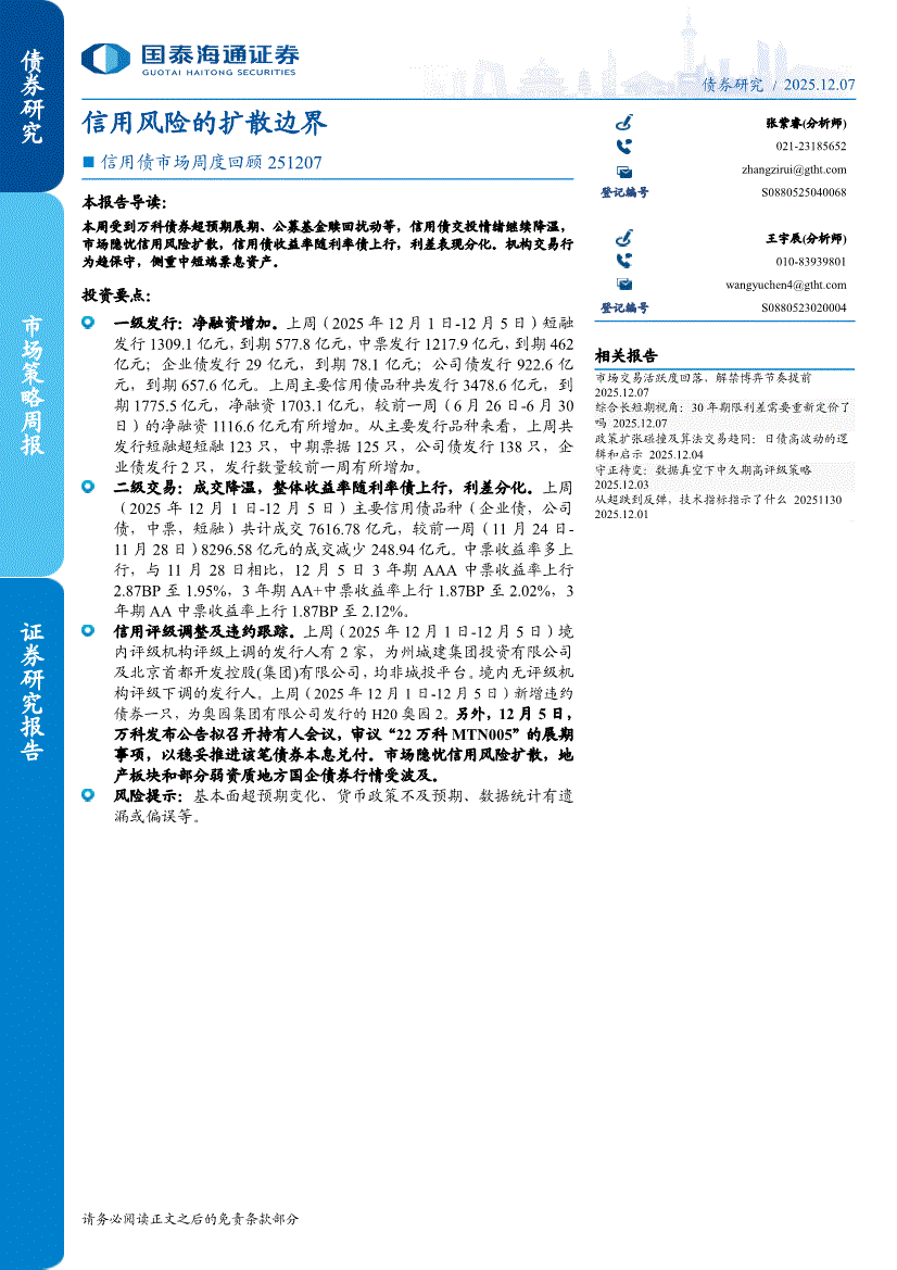 国泰海通证券-信用债市场周度回顾:信用风险的扩散边界-251207
