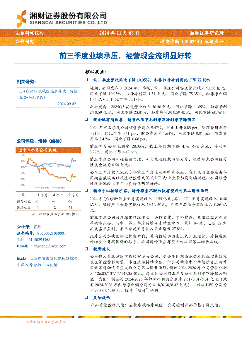 迪安诊断:湘财证券-迪安诊断-300244-业绩点评:前三季度业绩承压,经营现金流明显好转-241106