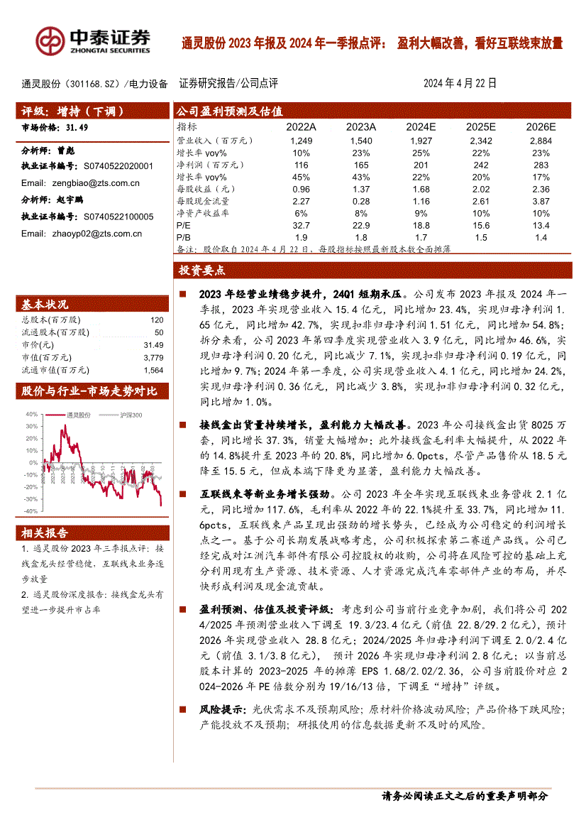 通灵股份:中泰证券-通灵股份-301168-2023年报及2024年一季报点评:盈利大幅改善,看好互联线束放量-240422