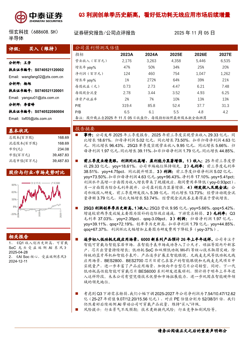 恒玄科技:中泰证券-恒玄科技-688608-Q3利润创单季历史新高,看好低功耗无线应用市场后续增量-251105