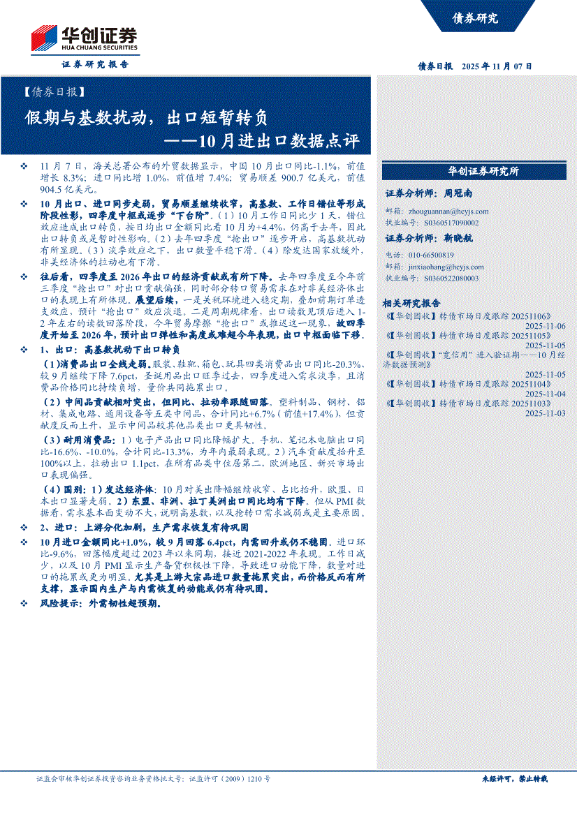 华创证券-10月进出口数据点评:假期与基数扰动,出口短暂转负-251107