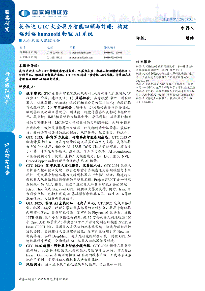 人形机器人行业:国泰海通证券-人形机器人行业跟踪报告:英伟达GTC大会具身智能回顾与前瞻,构建端到端humanoid物理AI系统-260314