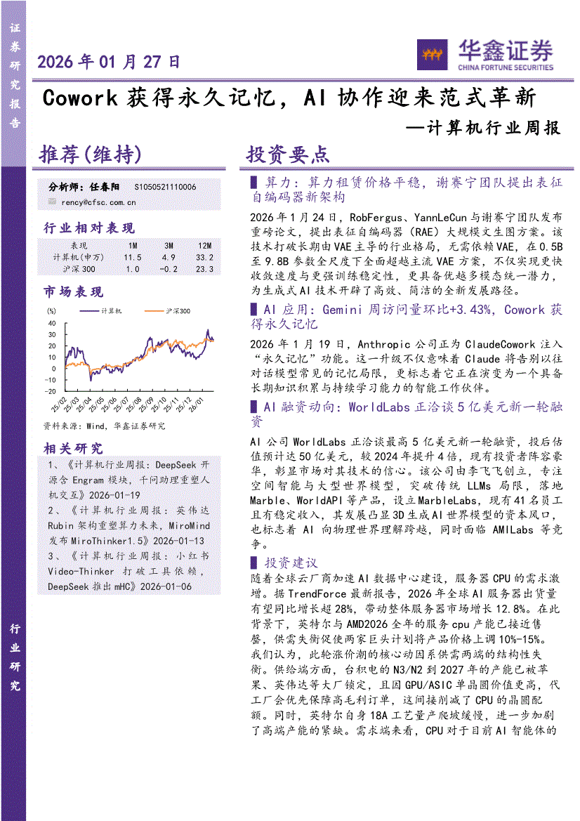 计算机行业:华鑫证券-计算机行业周报:Cowork获得永久记忆,AI协作迎来范式革新-260127