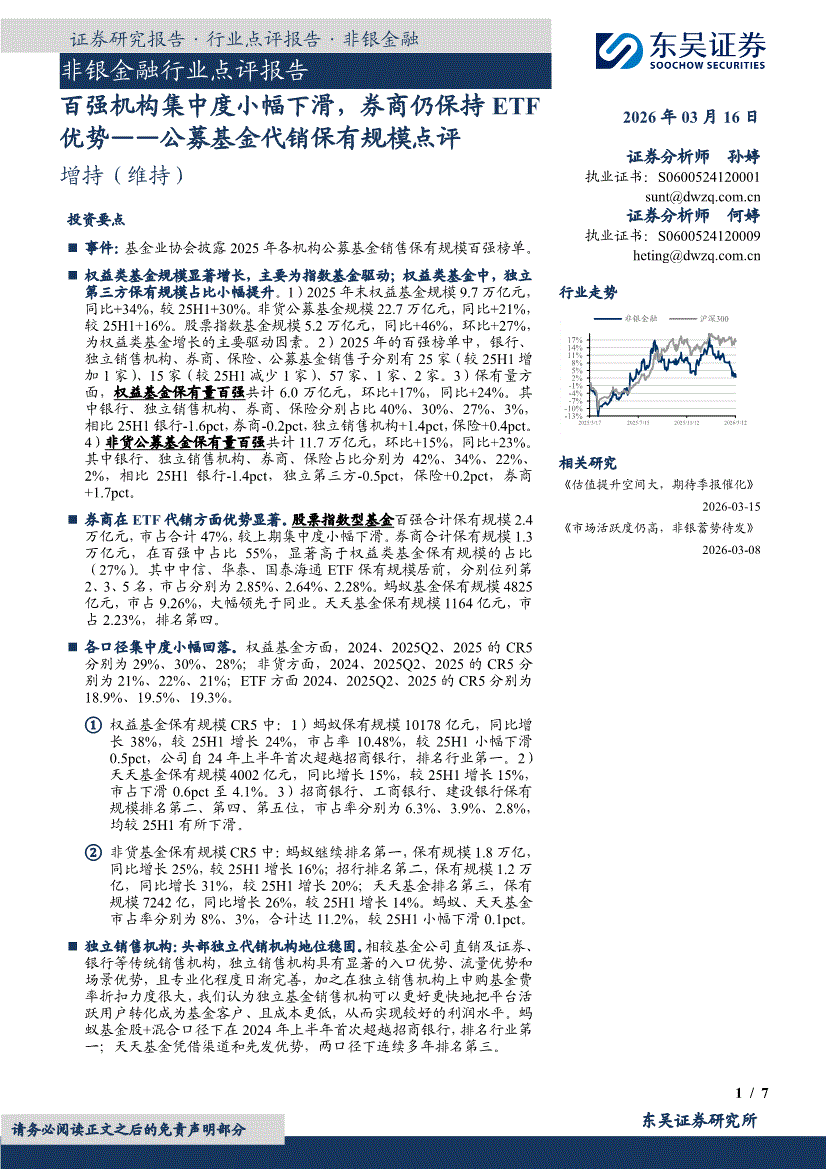 非银金融行业:东吴证券-非银金融行业点评报告:百强机构集中度小幅下滑,券商仍保持ETF优势——公募基金代销保有规模点评-260316