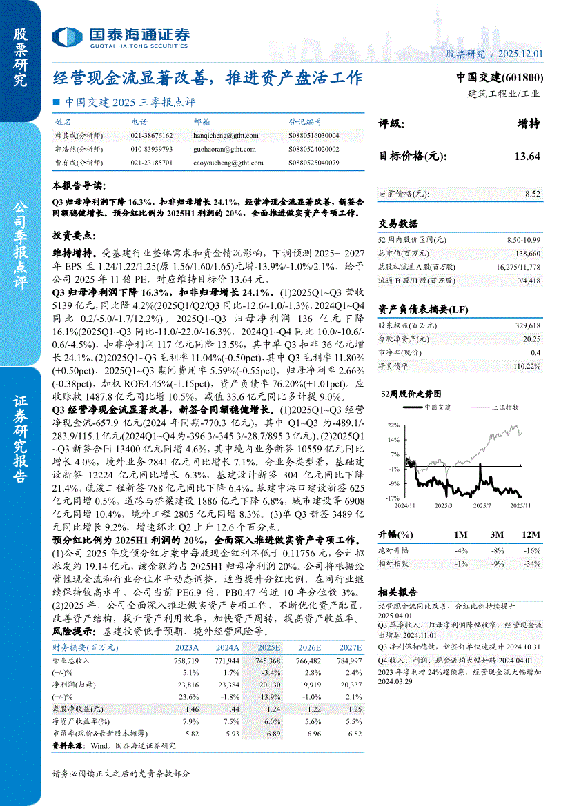 中国交建:国泰海通证券-中国交建-601800-2025三季报点评:经营现金流显著改善,推进资产盘活工作-251201