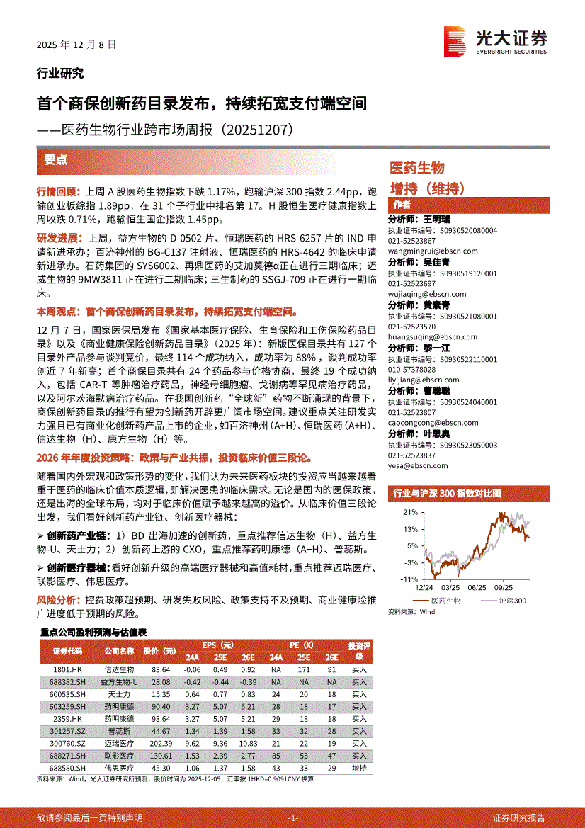 医药生物行业:光大证券-医药生物行业跨市场周报:首个商保创新药目录发布,持续拓宽支付端空间-251208
