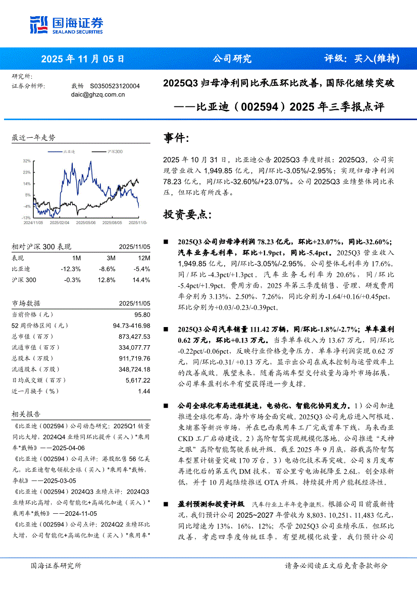 比亚迪:国海证券-比亚迪-002594-2025年三季报点评:2025Q3归母净利同比承压环比改善,国际化继续突破-251105