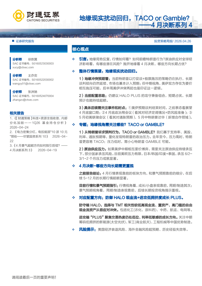 财通证券-4月决断系列4 :地缘现实扰动回归,TACO or Gamble?-260426