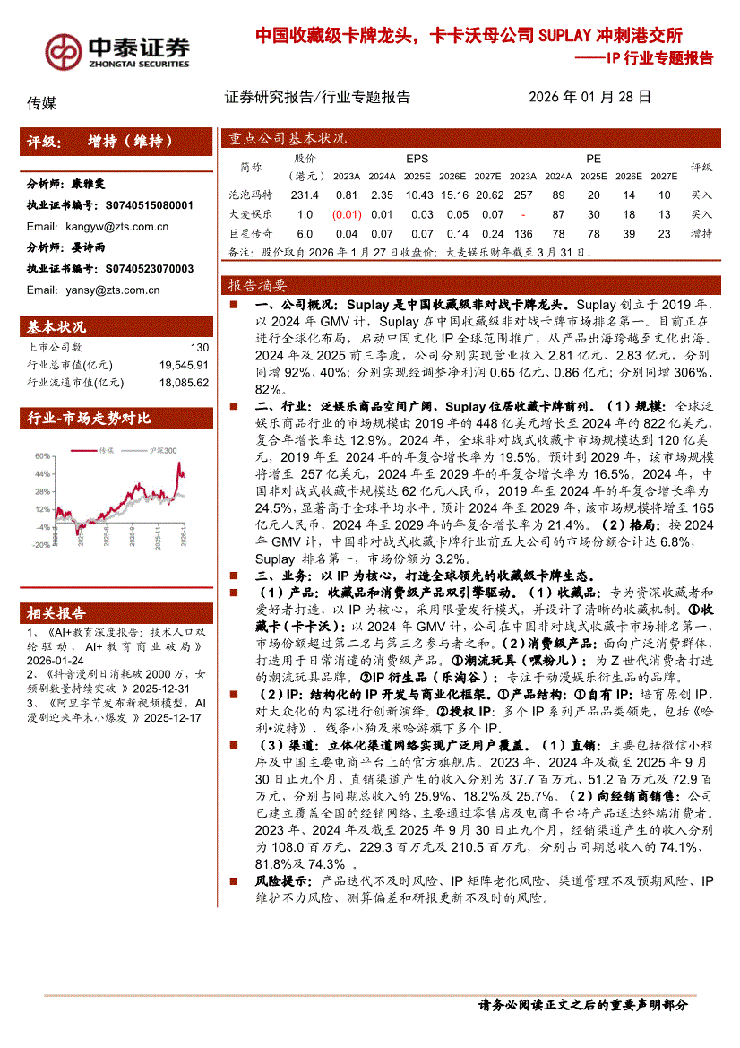 传媒行业:中泰证券-IP行业专题报告:中国收藏级卡牌龙头,卡卡沃母公司SUPLAY冲刺港交所-260128