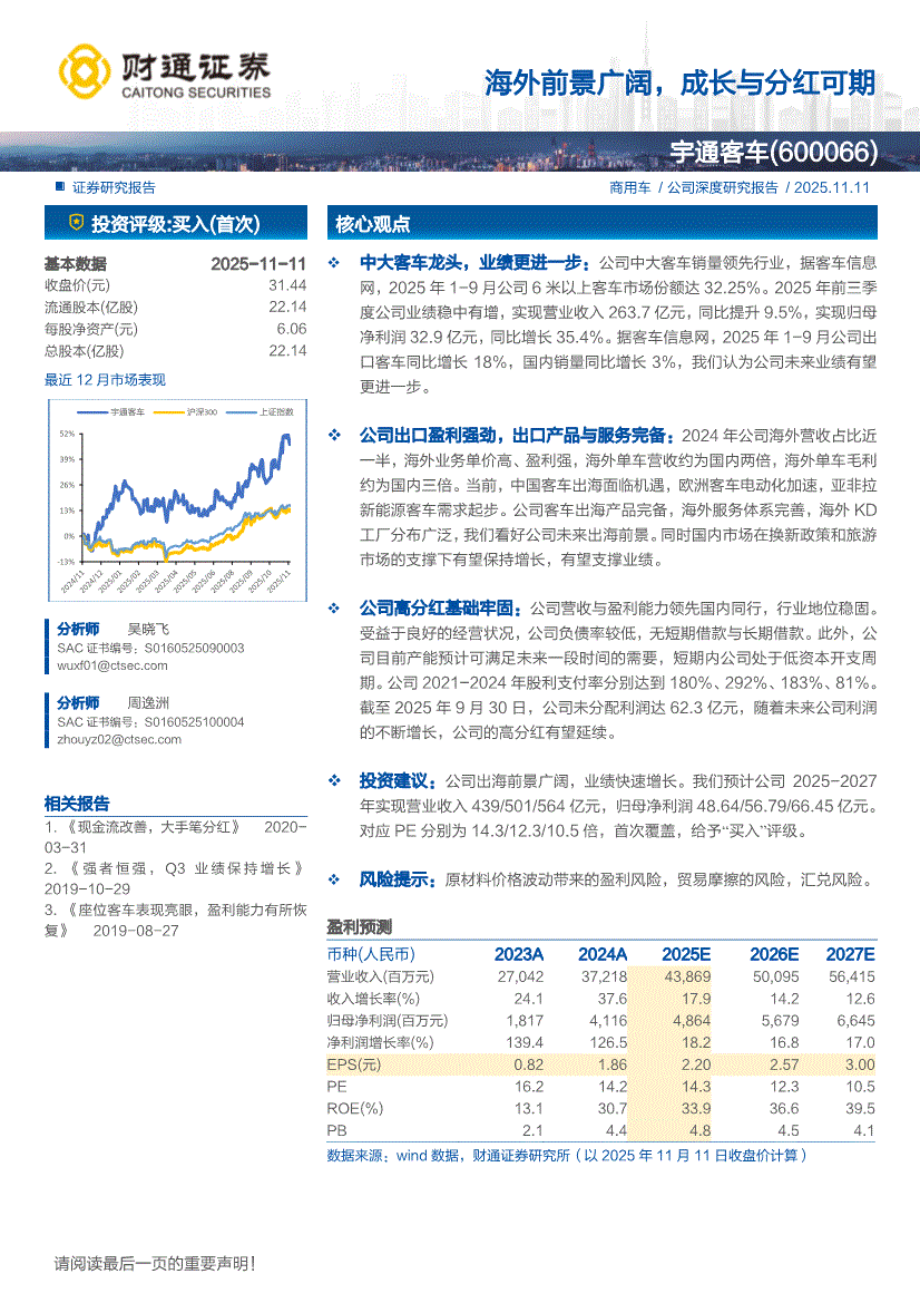 宇通客车:财通证券-宇通客车-600066-海外前景广阔,成长与分红可期-251111