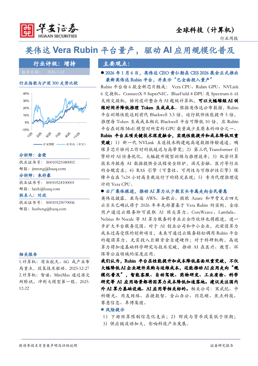 计算机行业:华安证券-全球科技(计算机)行业周报:英伟达Vera Rubin平台量产,驱动AI应用规模化普及-260112