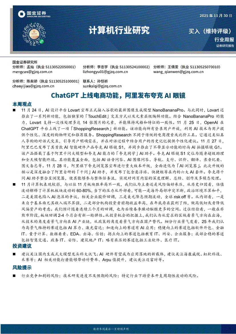 计算机行业:国金证券-计算机行业周报:ChatGPT上线电商功能,阿里发布夸克AI眼镜-251130