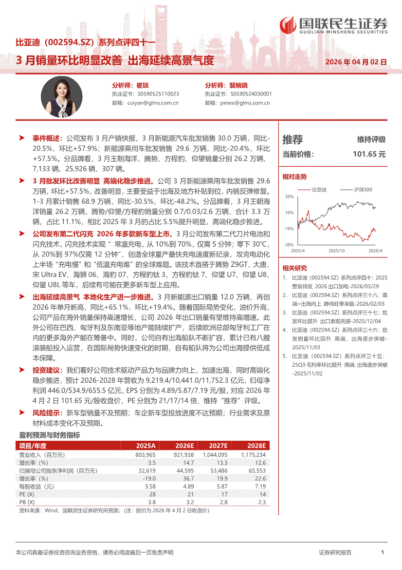 比亚迪:国联民生证券-比亚迪-002594-系列点评四十一:3月销量环比明显改善,出海延续高景气度-260402