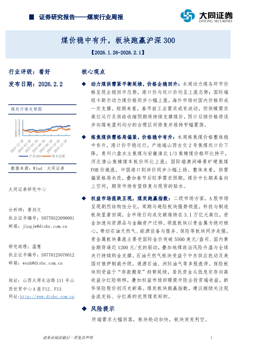 煤炭行业:大同证券-煤炭行业周报:煤价稳中有升,板块跑赢沪深300-260202
