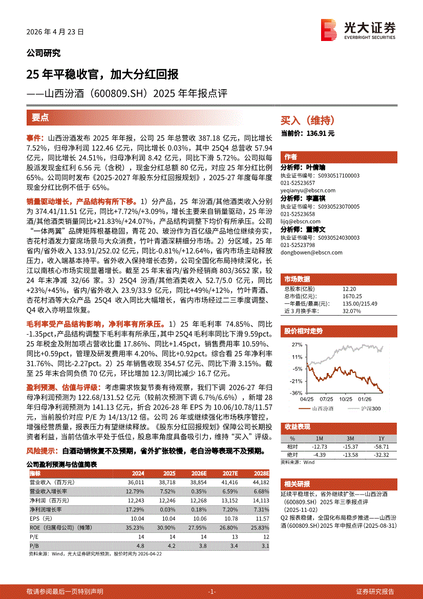 山西汾酒:光大证券-山西汾酒-600809-2025年年报点评:25年平稳收官,加大分红回报-260423