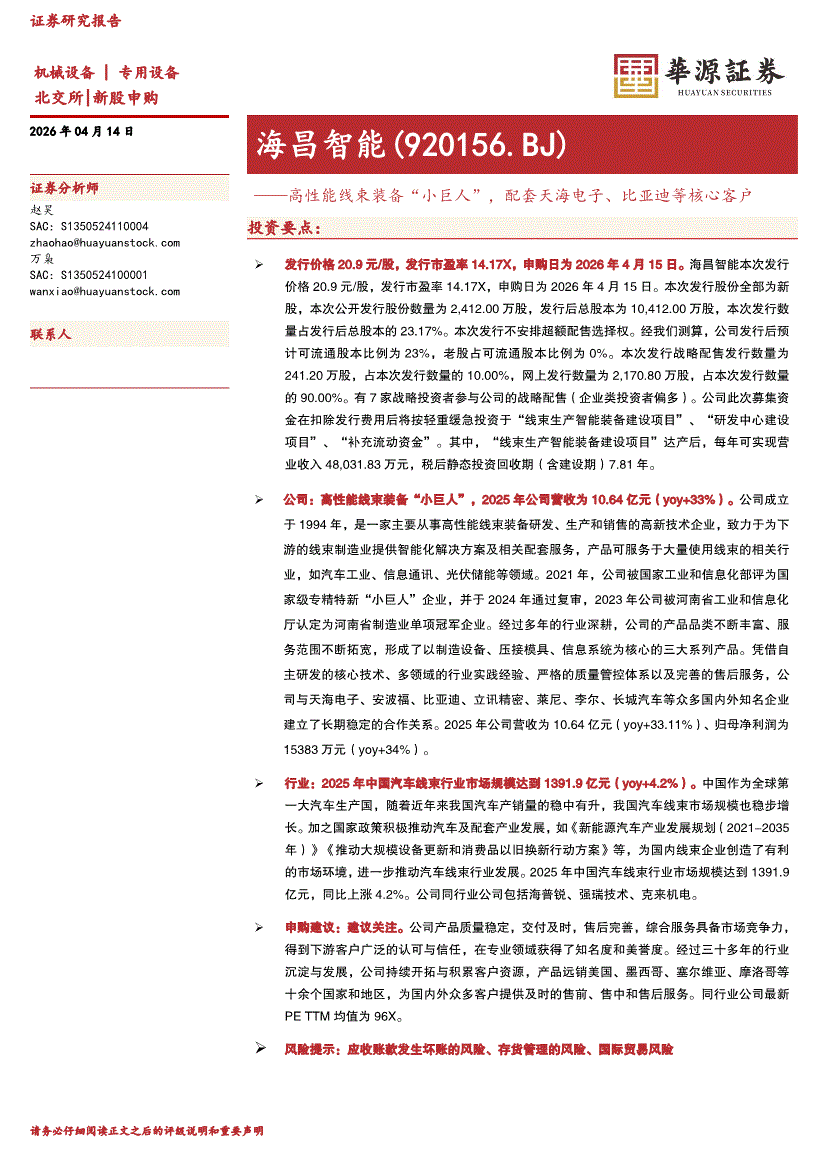 海昌智能:华源证券-海昌智能-920156-高性能线束装备“小巨人”,配套天海电子、比亚迪等核心客户-260414