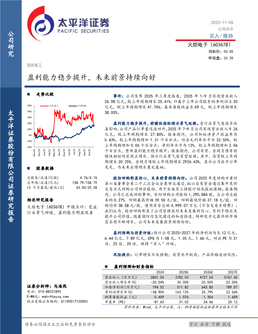 火炬电子:太平洋证券-火炬电子-603678-盈利能力稳步提升,未来前景持续向好-251108