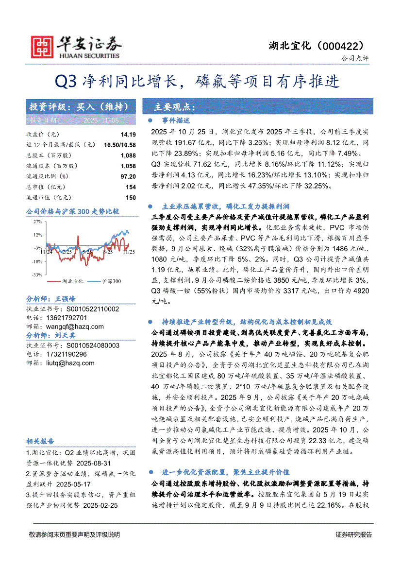湖北宜化:华安证券-湖北宜化-000422-Q3净利同比增长,磷氟等项目有序推进-251105