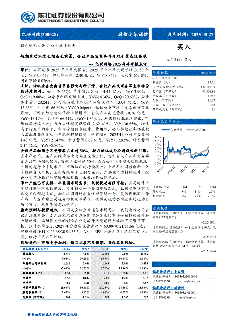 亿联网络:东北证券-亿联网络-300628-2025年半年报点评:短期扰动不改长期成长前景,会议产品及商务耳麦双引擎表现亮眼-250827