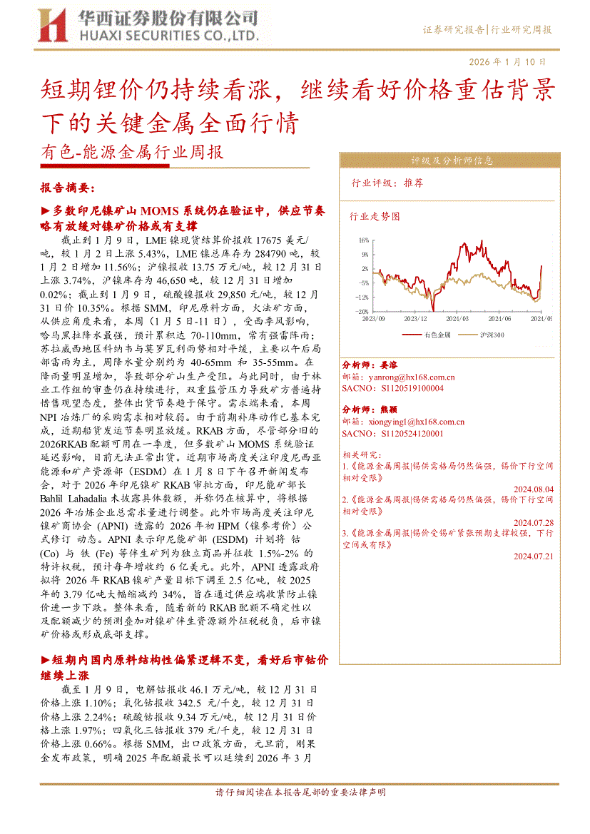 有色~能源金属行业:华西证券-有色~能源金属行业周报:短期锂价仍持续看涨,继续看好价格重估背景下的关键金属全面行情-260110