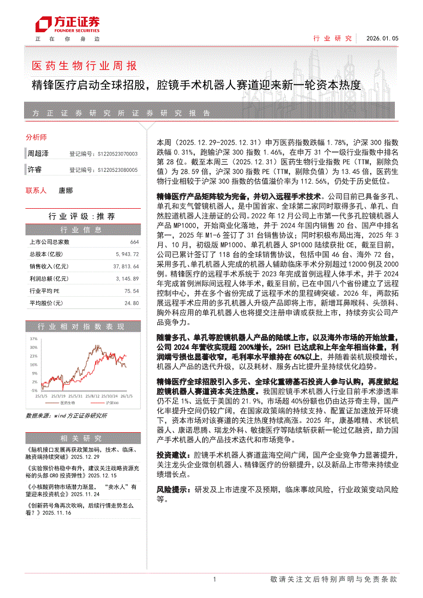 医药生物行业:方正证券-医药生物行业周报:精锋医疗启动全球招股,腔镜手术机器人赛道迎来新一轮资本热度-260105
