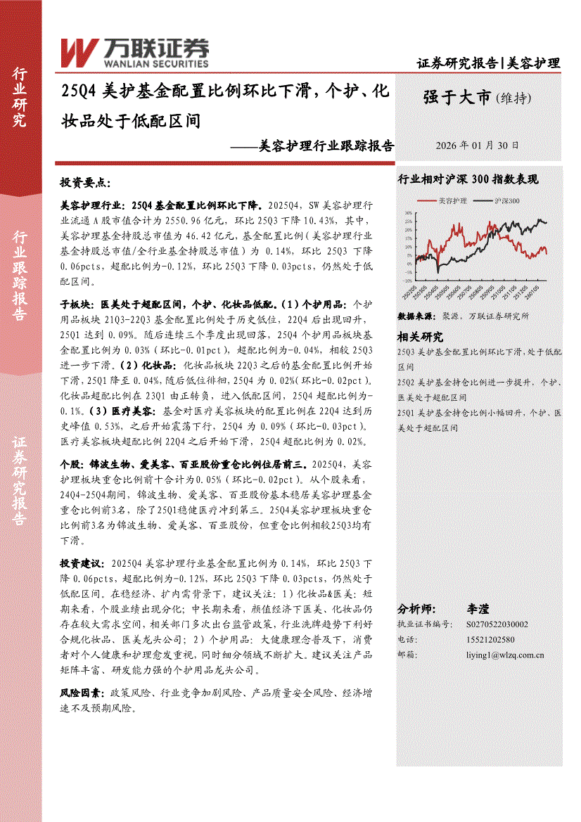 美容护理行业:万联证券-美容护理行业跟踪报告:25Q4美护基金配置比例环比下滑,个护、化妆品处于低配区间-260130