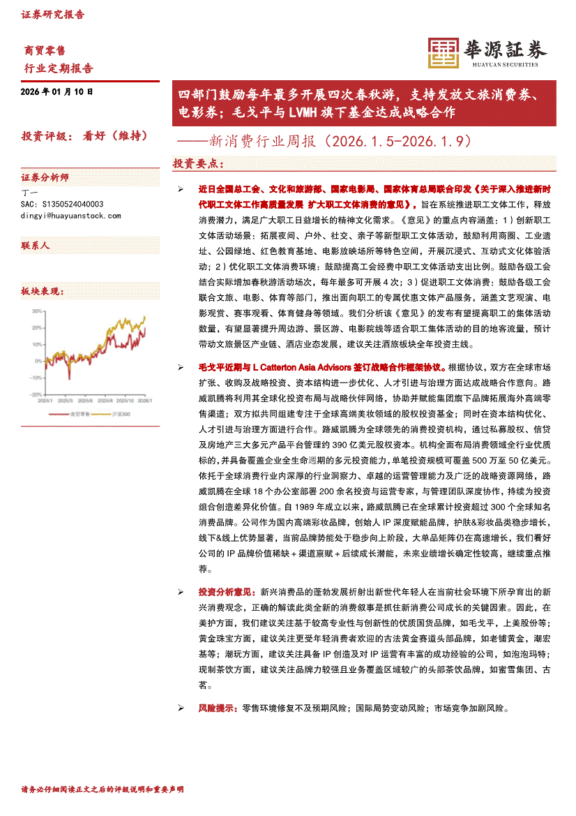 新消费行业:华源证券-新消费行业周报:四部门鼓励每年最多开展四次春秋游,支持发放文旅消费券、电影券;毛戈平与LVMH旗下基金达成战略合作-260110