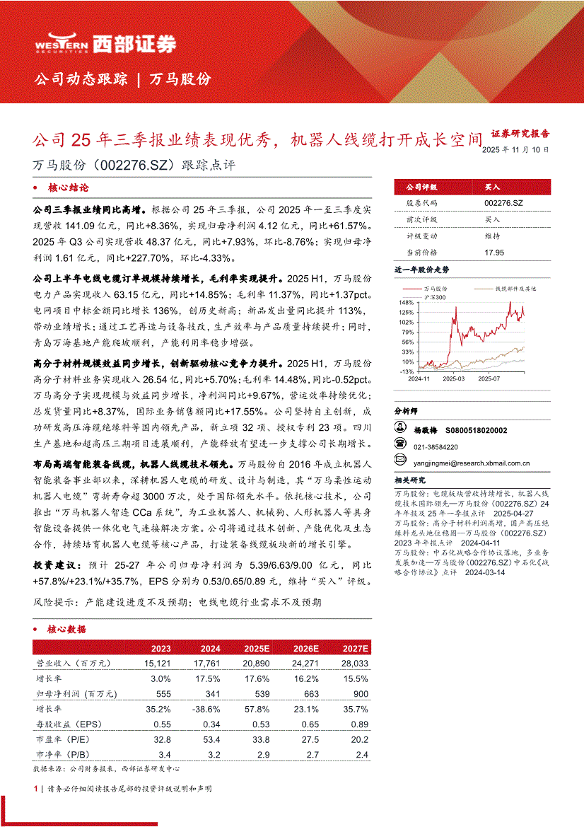 万马股份:西部证券-万马股份-002276-跟踪点评:公司25年三季报业绩表现优秀,机器人线缆打开成长空间-251110