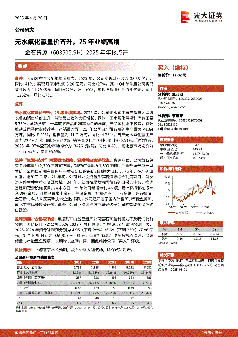 金石资源:光大证券-金石资源-603505-2025年年报点评:无水氟化氢量价齐升,25年业绩高增-260426