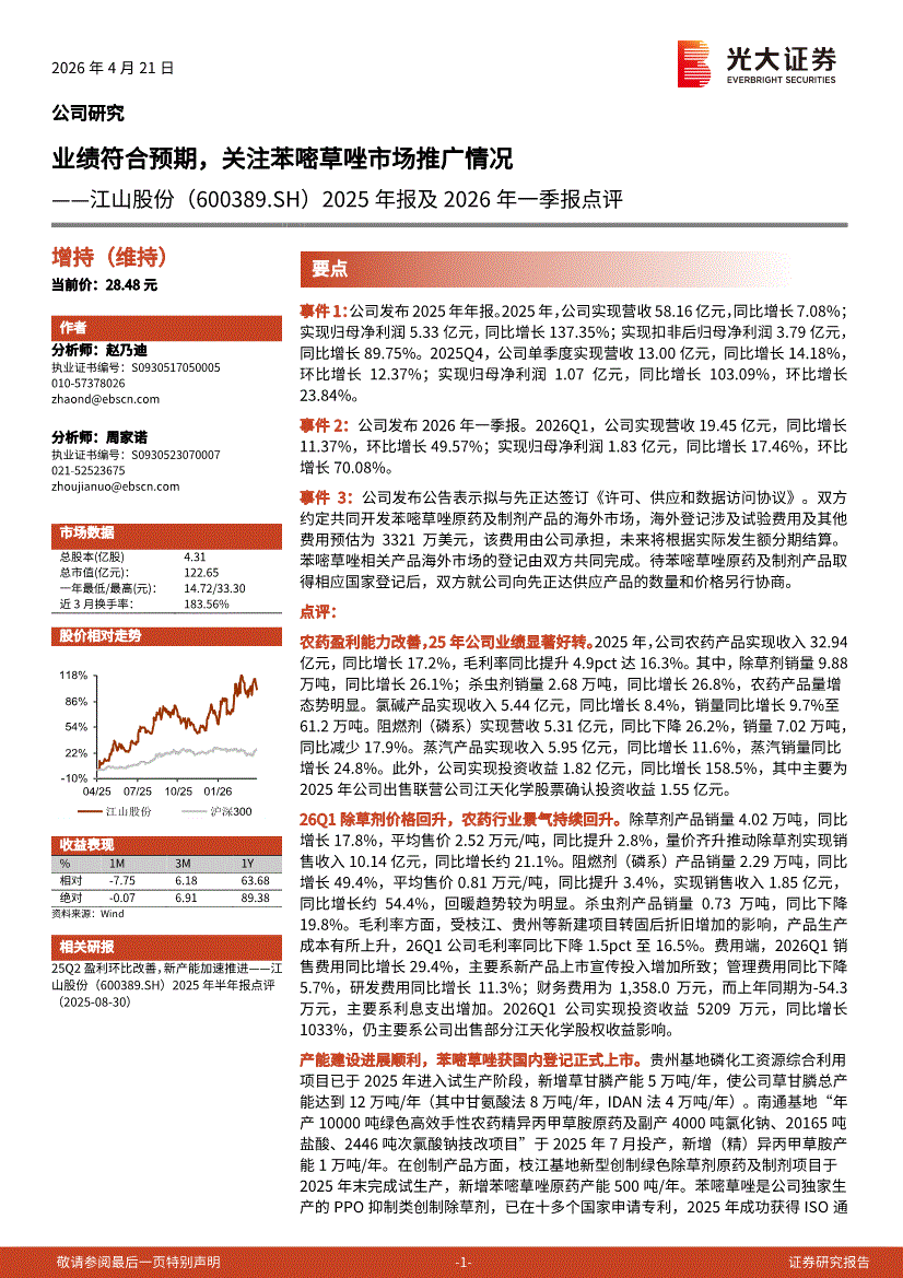 江山股份:光大证券-江山股份-600389-2025年报及2026年一季报点评:业绩符合预期,关注苯嘧草唑市场推广情况-260421