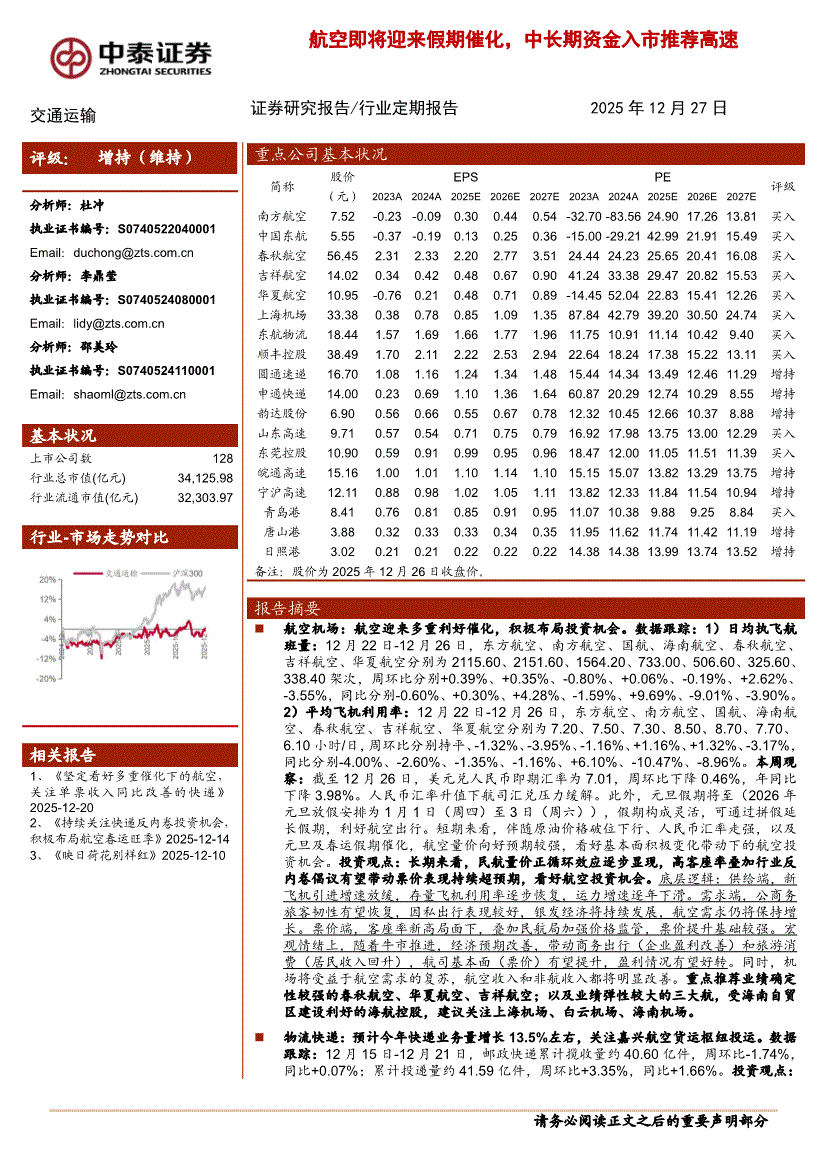 交通运输行业:中泰证券-交通运输行业:航空即将迎来假期催化,中长期资金入市推荐高速-251227
