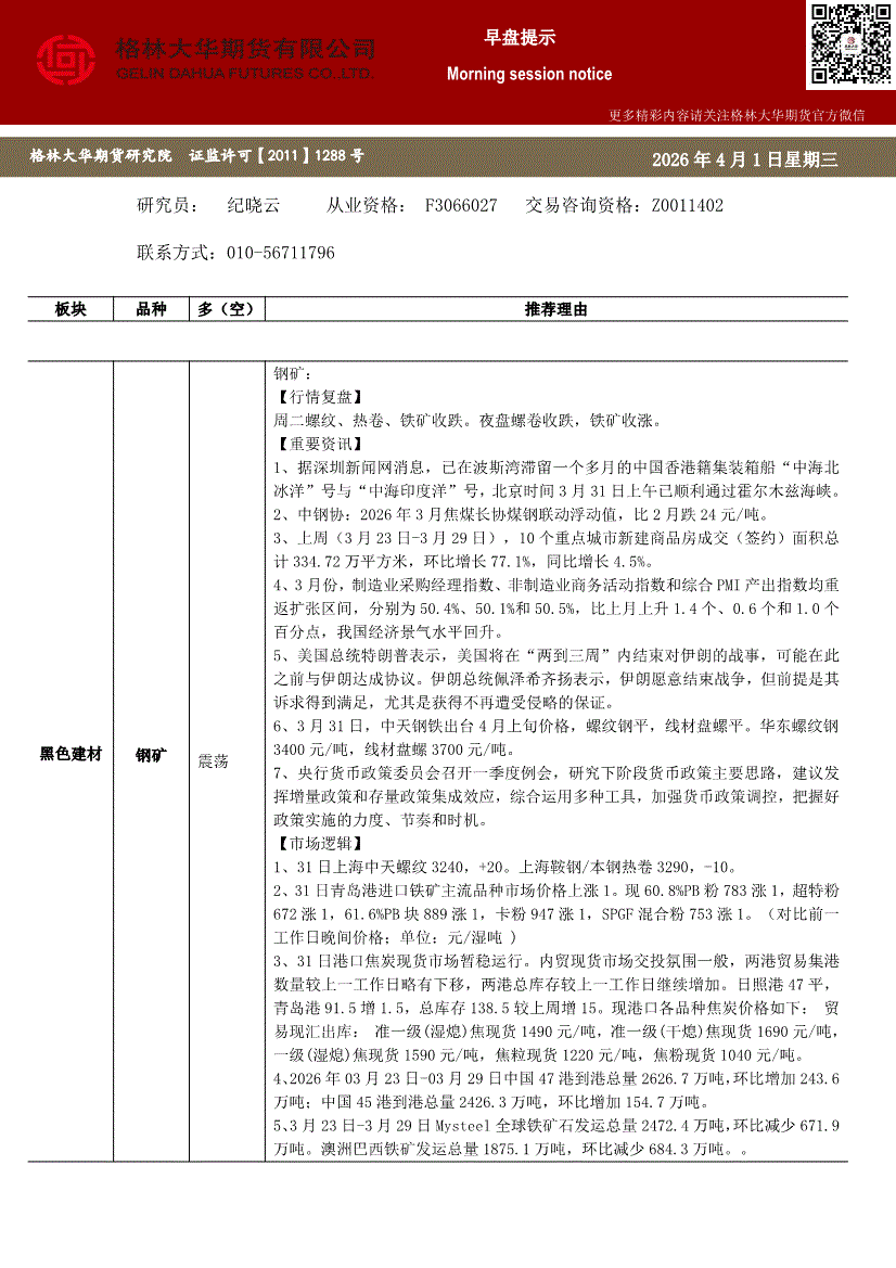 格林大华期货-早盘提示:钢矿-260401