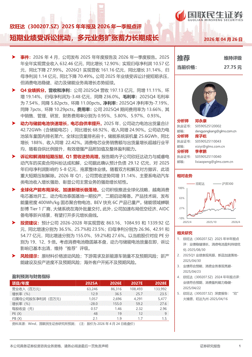 欣旺达:国联民生证券-欣旺达-300207-2025年年报及2026年一季报点评:短期业绩受诉讼扰动,多元业务扩张蓄力长期成长-260426