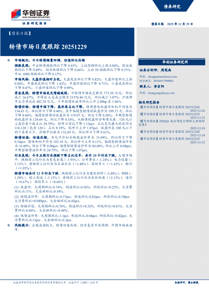 华创证券-【债券日报】转债市场日度跟踪-251229