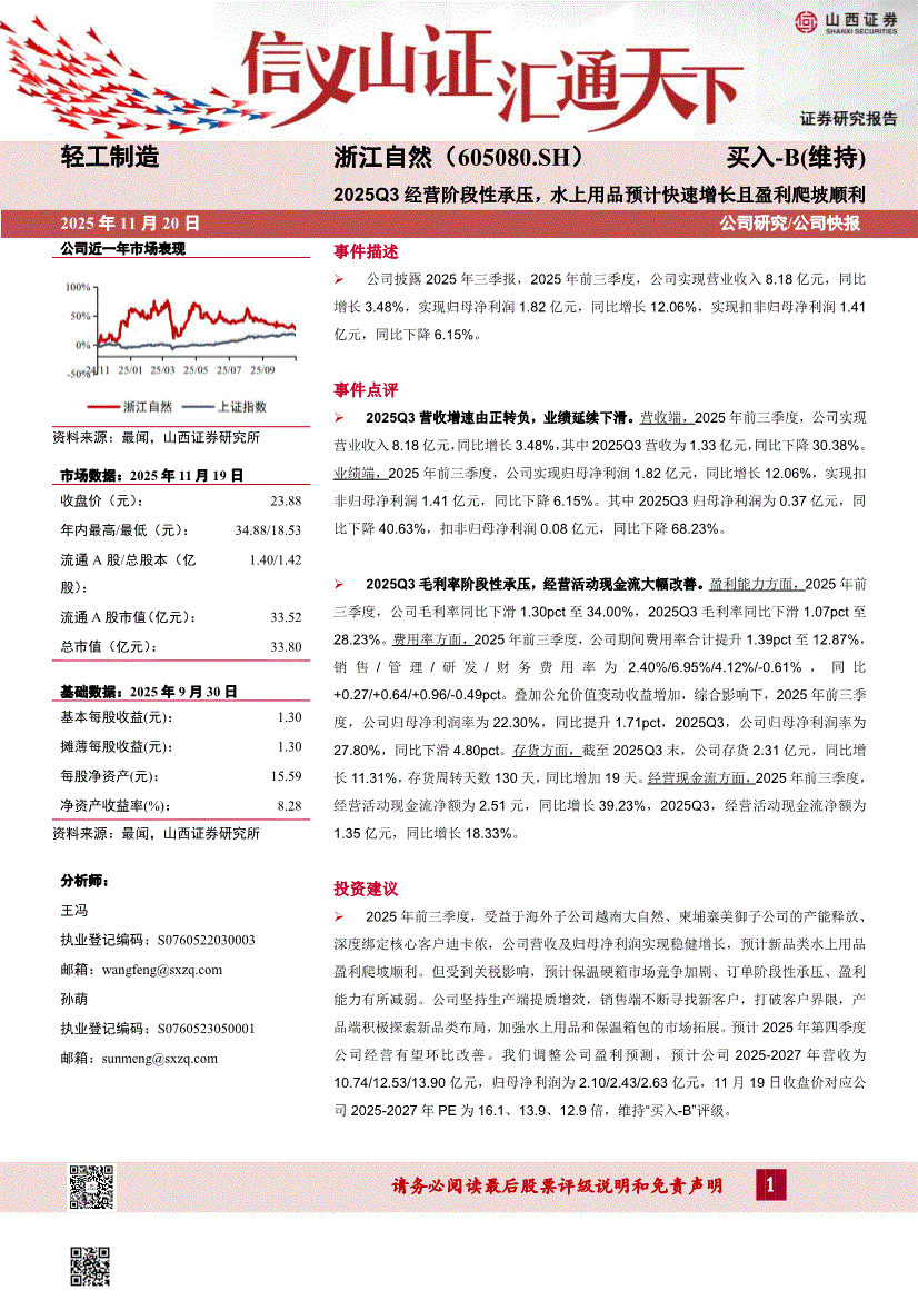 浙江自然:山西证券-浙江自然-605080-2025Q3经营阶段性承压,水上用品预计快速增长且盈利爬坡顺利-251120