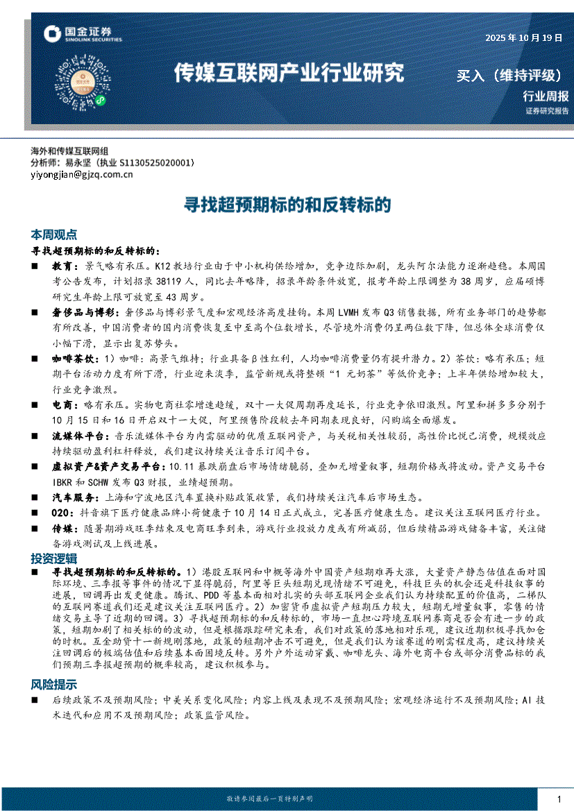 传媒互联网行业:国金证券-传媒互联网产业行业周报:寻找超预期标的和反转标的-251019